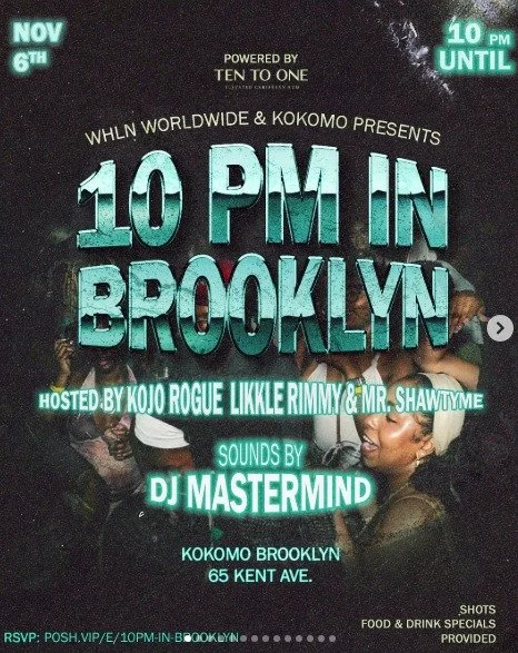 Back to All Events 10PM IN BROOKLYN Thursday, November 6, 2025 10:00 PM Friday, November 7, 2025 4:00 AM Google Calendar ICS Time: 10:00 pmLocation: Kokomo, BrooklynInfo: TICKETS