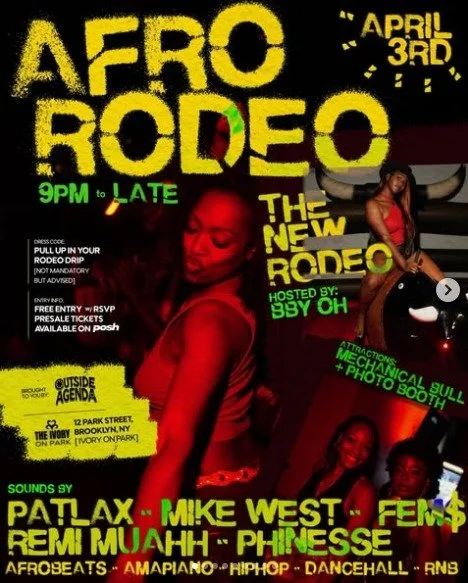 Afro Rodeo Friday, April 3, 2026 9:00 PM Saturday, April 4, 2026 3:00 AM Google Calendar ICS Time: 9:00 pmLocation: Damballa, BrooklynInfo: TICKETS