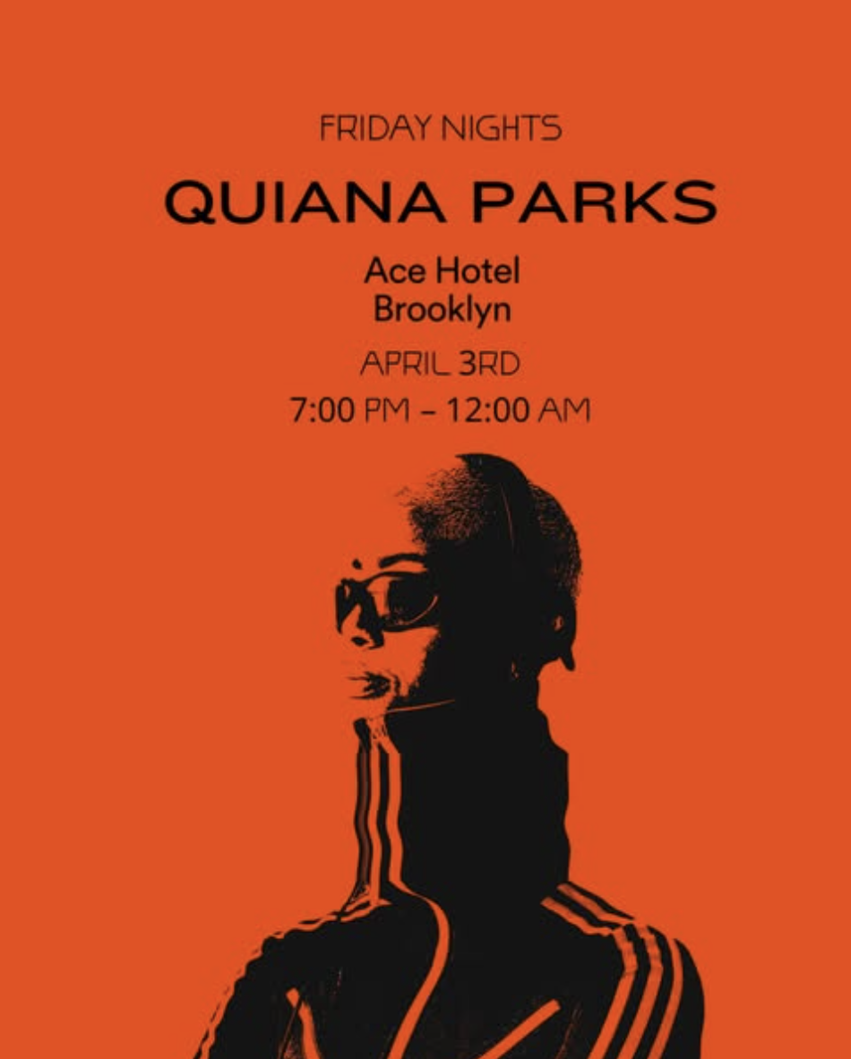 Quiana Parks @ Ace Hotel Friday, April 3, 2026 7:00 PM Saturday, April 4, 2026 12:00 AM Google Calendar ICS Time: 7:00 pmLocation: Ace Hotel, BrooklynInfo: TICKETS