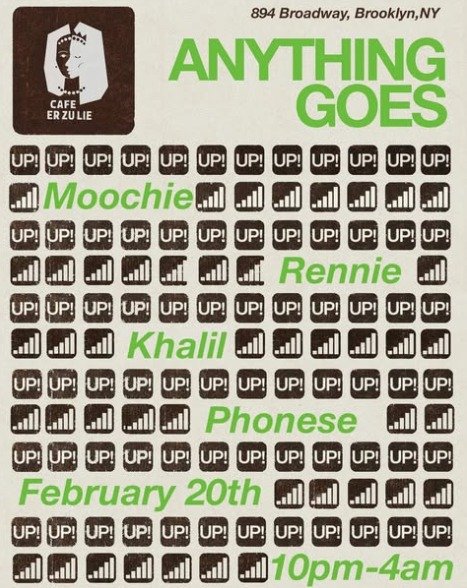 ANYTHING GOES Friday, February 20, 2026 10:00 PM Saturday, February 21, 2026 4:00 AM Google Calendar ICS Time: 10:00 pmLocation: Cafe Erzulie, BrooklynInfo: TICKETS