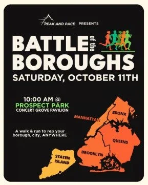 Battle of The Boroughs Run Saturday, October 11, 2025 10:00 AM 11:00 AM Google Calendar ICS Time: 10:00 amLocation: Concert Grove Pavilion, Prospect Park, BrooklynInfo: TICKETS