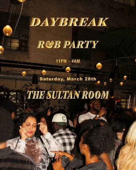 DayBreak: R&B Party Saturday, March 28, 2026 11:00 PM Sunday, March 29, 2026 4:00 AM Google Calendar ICS Time: 11:00 pmLocation: The Sultan Room, BrooklynInfo: TICKETS