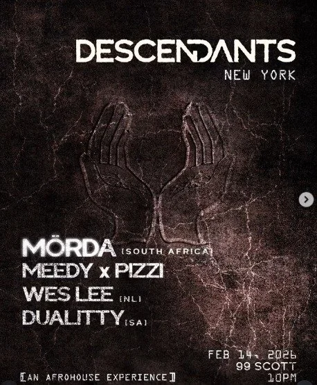 Back to All Events DESCENDANTS: An Afro House Experience with MORDA [South Africa] & More Saturday, February 14, 2026 10:00 PM Sunday, February 15, 2026 4:00 AM Google Calendar ICS Time: 10:00 pmLocation: 99 Scott Ave, BrooklynInfo: TICKETS