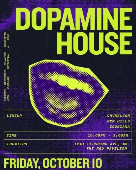 DOPAMINE HOUSE Friday, October 10, 2025 10:00 PM Saturday, October 11, 2025 4:00 AM Google Calendar ICS Time: 10:00 pmLocation: Red Pavillion, BrooklynInfo: TICKETS