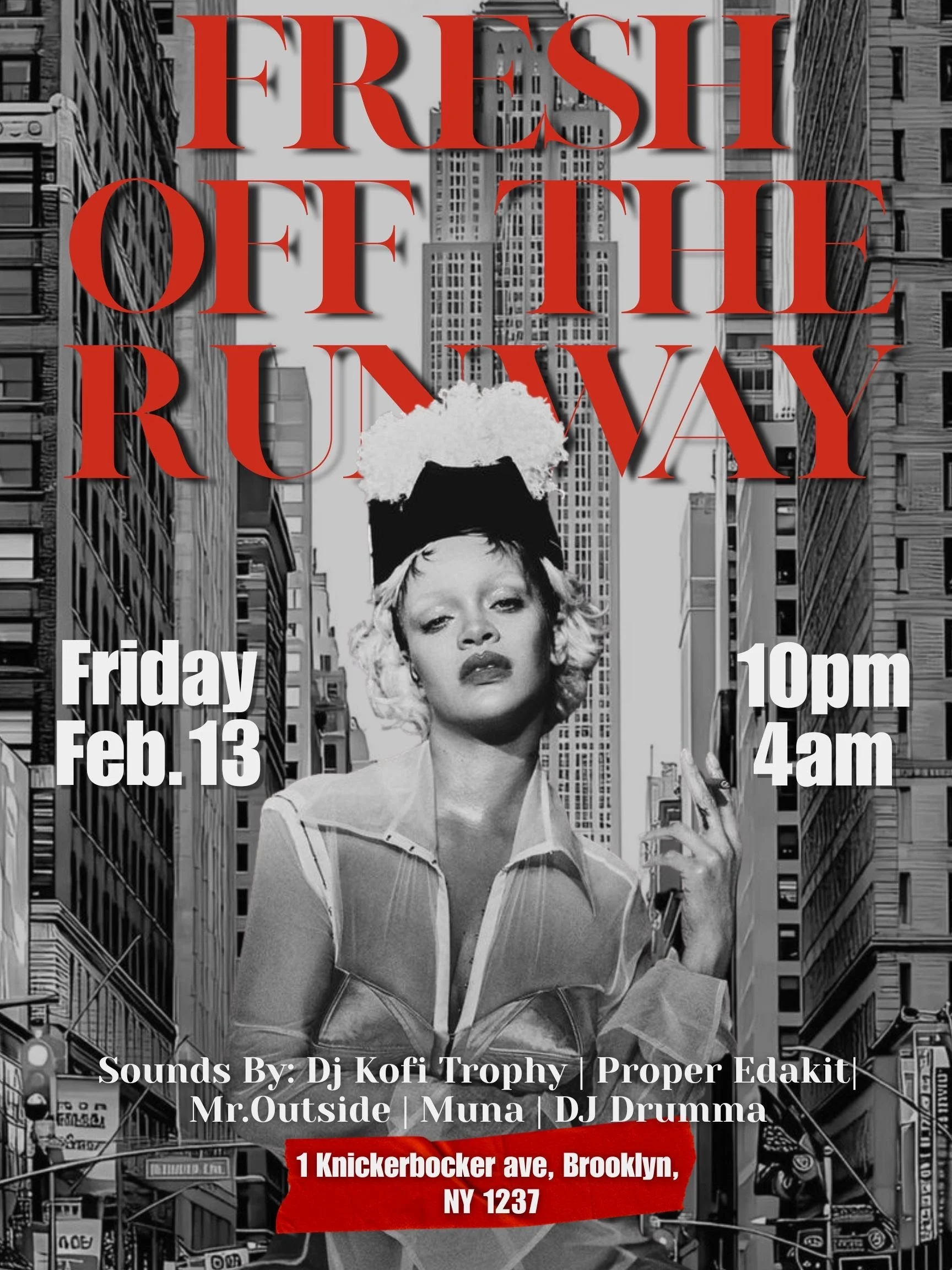 Fresh Off The Runway Friday, February 13, 2026 10:00 PM Saturday, February 14, 2026 4:00 AM Google Calendar ICS Time: 10:00 pmLocation: About Last Night, BrooklynInfo: TICKETS