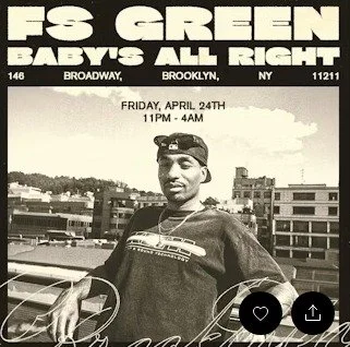 FS Green Live in Brooklyn Friday, April 24, 2026 11:00 PM Saturday, April 25, 2026 4:00 AM Google Calendar ICS Time: 11:00 pmLocation: Baby's All Right, BrooklynInfo: TICKETS