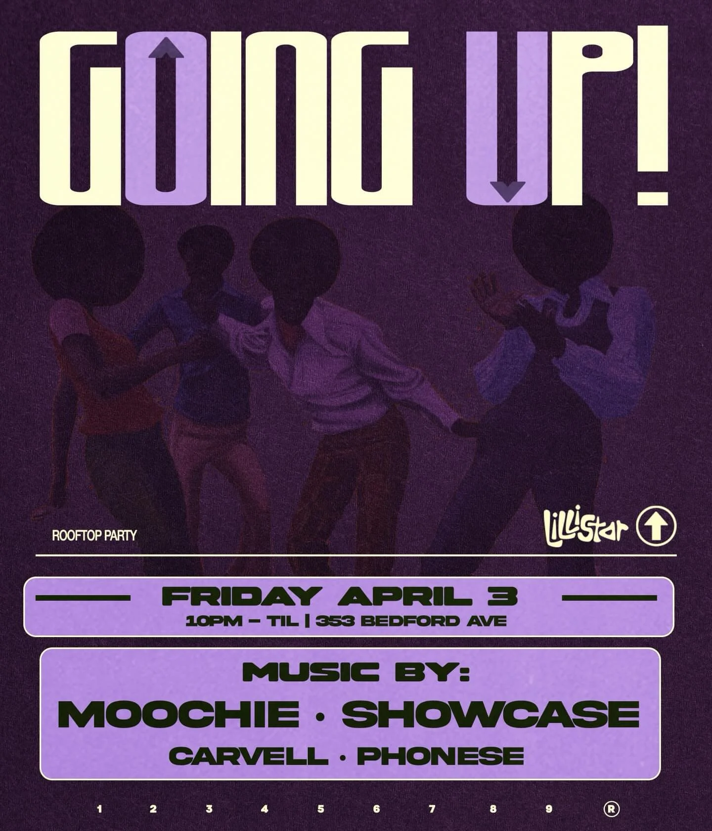 Going Up Friday, April 3, 2026 10:00 PM Saturday, April 4, 2026 4:00 AM Google Calendar ICS Time: 10:00 pmLocation: Lillistar, BrooklynInfo: TICKETS