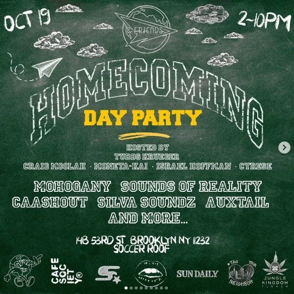 Homecoming Day Party Sunday, October 19, 2025 2:00 PM 10:00 PM Google Calendar ICS Time: 2:00 pmLocation: Socceroof, BrooklynInfo: TICKETS
