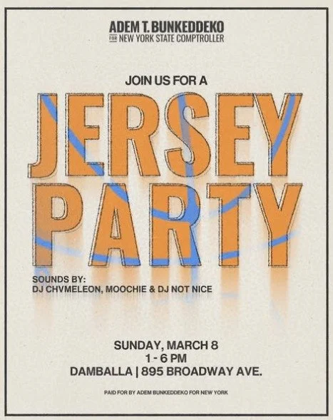 Jersey Party + Adem T. Bunkeddeko Sunday, March 8, 2026 1:00 PM 6:00 PM Google Calendar ICS Time: 1:00 pmLocation: Damballa, BrooklynInfo: TICKETS