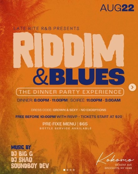 Late Nite R&B Presents: Riddim & Blues Friday, August 22, 2025 8:00 PM Saturday, August 23, 2025 2:00 AM Google Calendar ICS Time: 8:00 pmLocation: Kokomo, BrooklynInfo: TICKETS