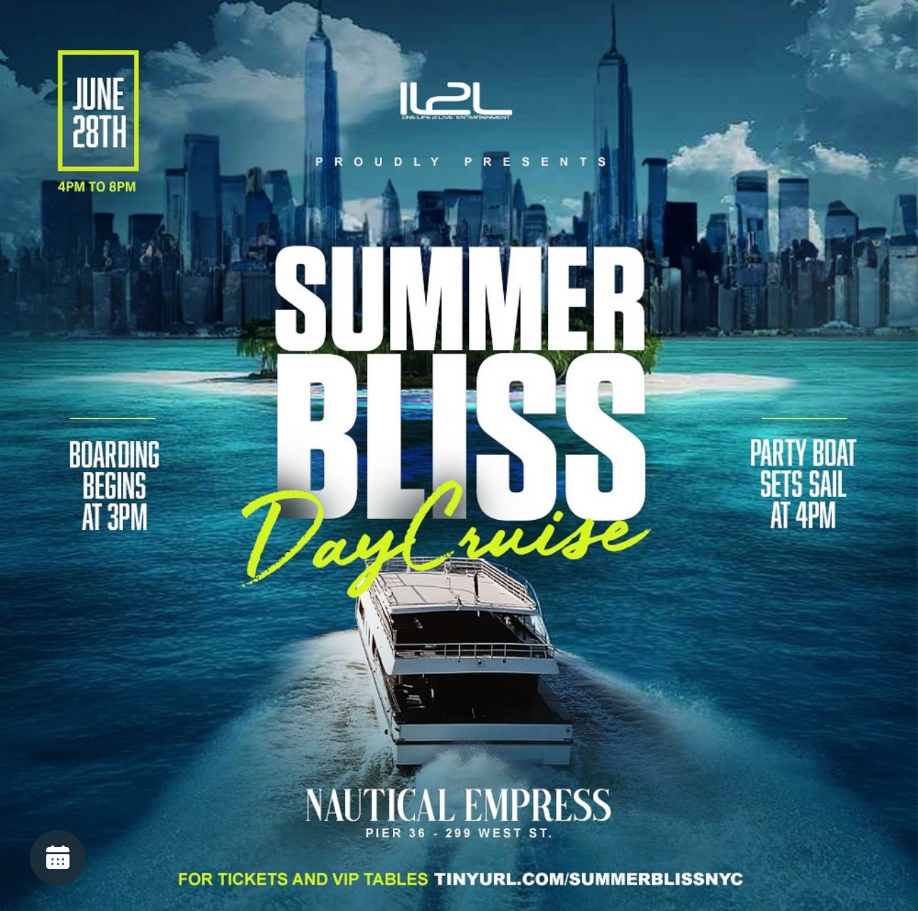Summer Bliss Day Cruise - Use Code ‘VIP’ for $10 off Saturday, June 28, 2025 4:00 PM 8:00 PM Google Calendar ICS Time: 4:00 pmLocation: Pier 36, ManhattanInfo: TICKETS