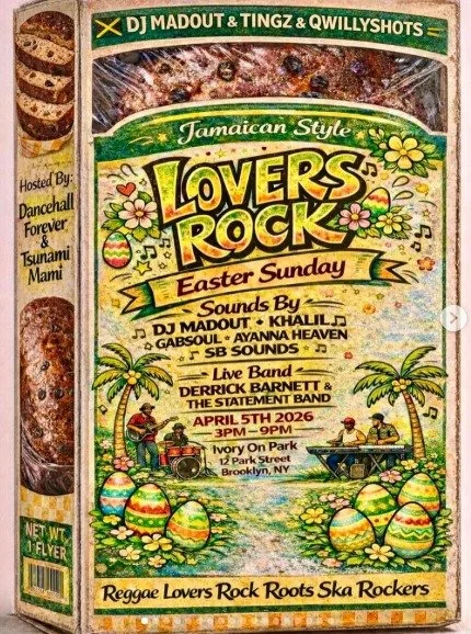Back to All Events Lovers Rock Sunday, April 5, 2026 3:00 PM 9:00 PM Google Calendar ICS Time: 3:00 pmLocation: Ivory on Park, BrooklynInfo: TICKETS