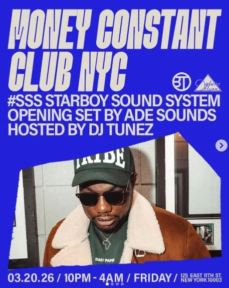 MONEY CONSTANT CLUB Friday, March 20, 2026 10:00 PM Saturday, March 21, 2026 4:00 AM Google Calendar ICS Time: 10:00 pmLocation: Deluxx Fluxx, ManhattanInfo: TICKETS