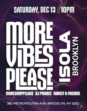Back to All Events MOREVIBESPLEASE Saturday, December 13, 2025 10:00 PM Sunday, December 14, 2025 4:00 AM Google Calendar ICS Time: 10:00 pmLocation: Isola, BrooklynInfo: TICKETS