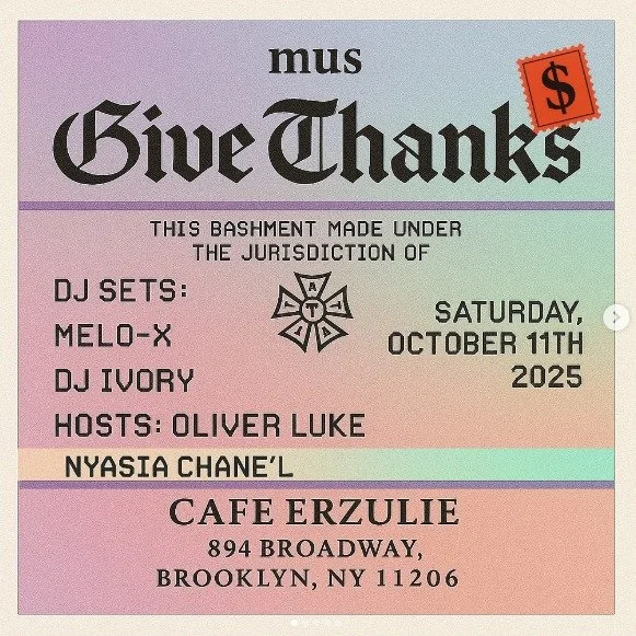 Mus Give Thanks Saturday, October 11, 2025 10:00 PM Sunday, October 12, 2025 4:00 AM Google Calendar ICS Time: 10:00 pmLocation: Cafe Erzulie, Brooklyn Info: TICKETS