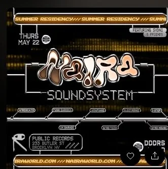 NAIRA PARTY Thursday, May 22, 2025 11:00 PM Friday, May 23, 2025 3:00 AM Google Calendar ICS Time: 11:00 pmLocation: Public Records, BrooklynInfo: TICKETS