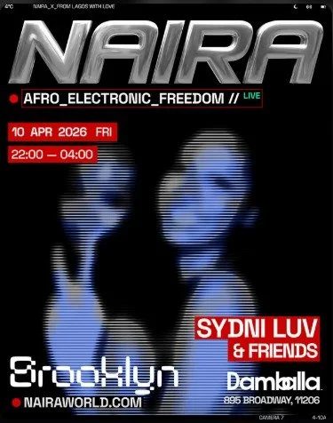 Back to All Events NAIRA Friday, April 10, 2026 10:00 PM Saturday, April 11, 2026 4:00 AM Google Calendar ICS Time: 10:00 pmLocation: Damballa, BrooklynInfo: TICKETS
