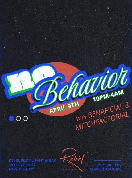 Back to All Events No Behavior Thursday, April 9, 2026 10:00 PM Saturday, April 11, 2026 4:00 AM Google Calendar ICS Time: 10:00 pmLocation: Rebel, ManhattanInfo: TICKETS