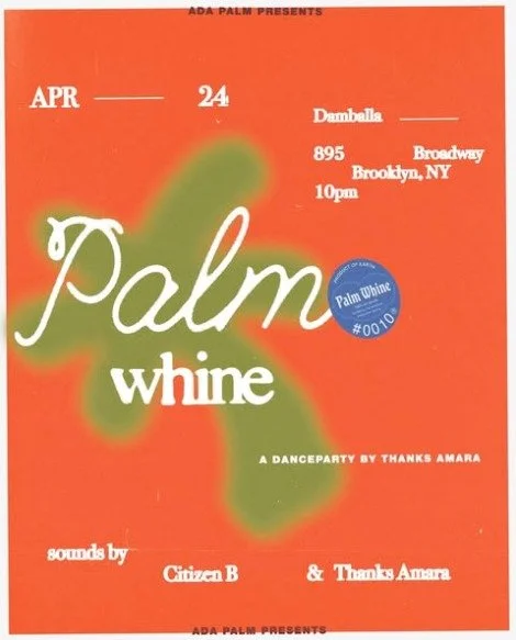 Back to All Events Palm Whine Friday, April 24, 2026 10:00 PM Saturday, April 25, 2026 4:00 AM Google Calendar ICS Time: 10:00 pmLocation: Damballa, BrooklynInfo: TICKETS