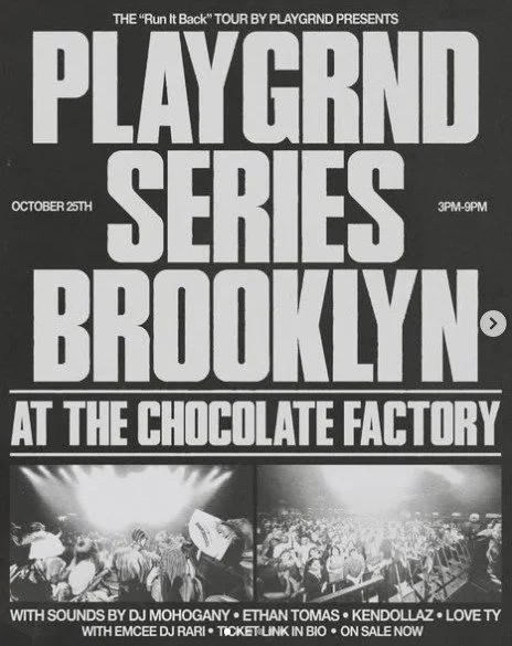 PLAYGRND SERIES Saturday, October 25, 2025 3:00 PM 9:00 PM Google Calendar ICS Time: 3:00 pmLocation: The Chocolate Factory, BrooklynInfo: TICKETS