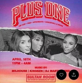 Plus One Saturday, April 18, 2026 11:00 PM Sunday, April 19, 2026 4:00 AM Google Calendar ICS Time: 11:00 pmLocation: Sultan Room, BrooklynInfo: TICKETS