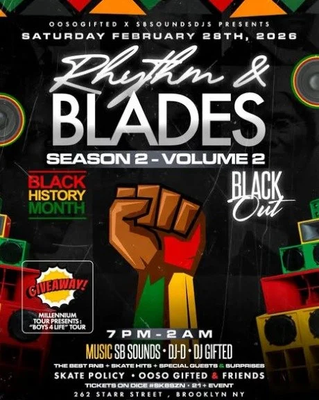 Rhythm and Blades (skate) Saturday, February 28, 2026 7:00 PM Sunday, March 1, 2026 2:00 AM Google Calendar ICS Time: 700 pmLocation: Arlo Williamsburg, BrooklynInfo: TICKETS