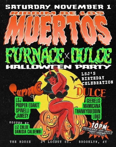 Back to All Events Riddim De Los Muertos (Furnace X Dulce Halloween Party) Saturday, November 1, 2025 10:00 PM Sunday, November 2, 2025 4:00 AM Google Calendar ICS Time: 10:00 pmLocation: The House, BrooklynInfo: TICKETS