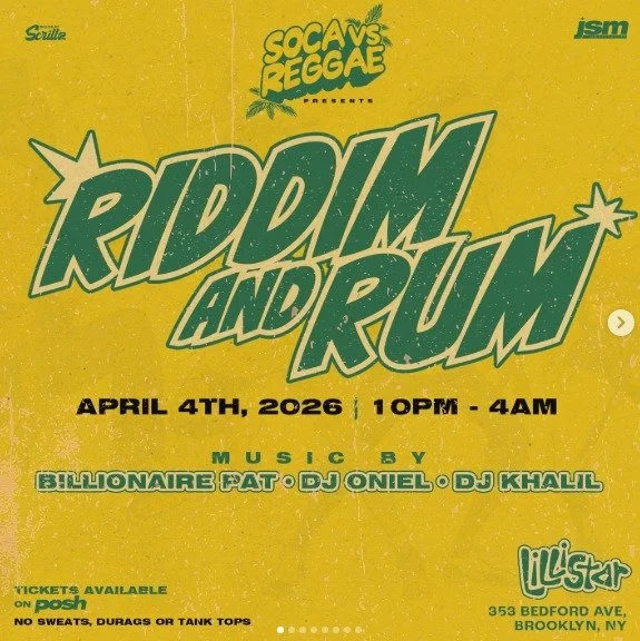 Riddim & Rum Saturday, April 4, 2026 10:00 PM Sunday, April 5, 2026 4:00 AM Google Calendar ICS Time: 10:00 pmLocation: Lillistar, BrooklynInfo: TICKETS