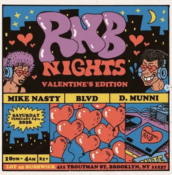 Back to All Events RNB Nights: Valentine's Edition Saturday, February 14, 2026 10:00 PM Sunday, February 15, 2026 4:00 AM Google Calendar ICS Time: 10:00 pmLocation: Lot45, BrooklynInfo: TICKETS
