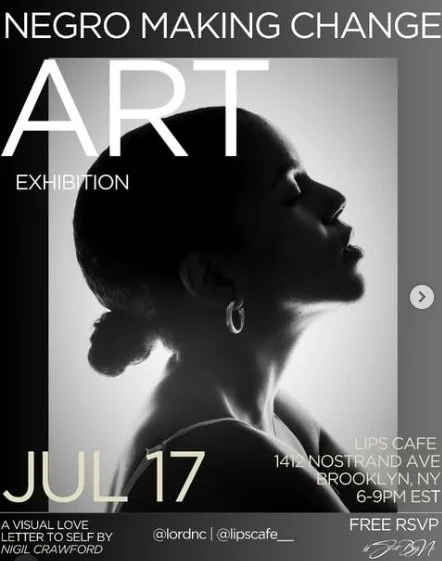 Back to All Events Negro Making Change - Art Exhibit Thursday, July 17, 2025 6:00 PM 9:00 PM Google Calendar ICS Time: 6:00 pmLocation: Lips Cafe, Brooklyn Info: TICKETS