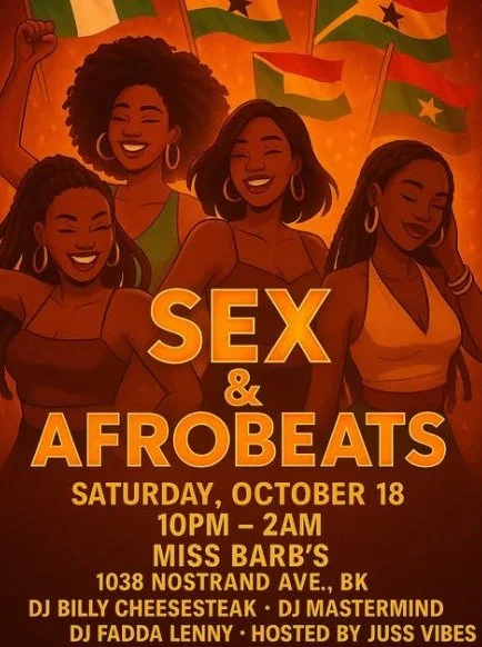 Sex And Afrobeats Saturday, October 18, 2025 10:00 PM Sunday, October 19, 2025 2:00 AM Google Calendar ICS Time: 10:00 pmLocation: Miss Barbs, BrooklynInfo: TICKETS