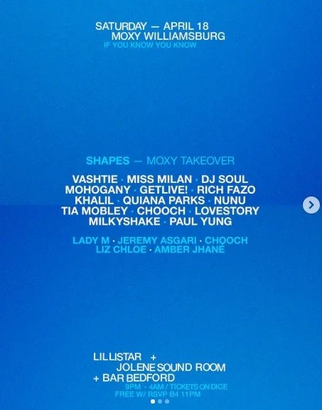 Shapes Saturday, April 18, 2026 9:00 PM Sunday, April 19, 2026 2:00 AM Google Calendar ICS Time: 9:00 pmLocation: Moxy Williamsburg, BrooklynInfo: TICKETS
