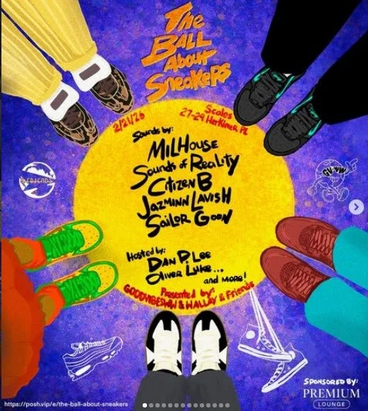 The Ball About Sneakers Saturday, February 21, 2026 10:00 PM Sunday, February 22, 2026 4:00 AM Google Calendar ICS Time: 10:00 pmLocation: Scales, BrooklynInfo: TICKETS