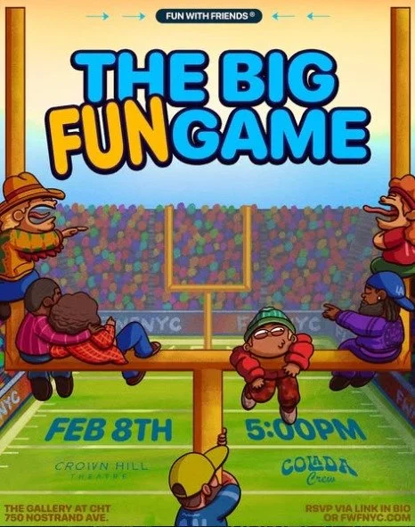 The Big (FUN) Game Sunday, February 8, 2026 5:00 PM 10:00 PM Google Calendar ICS Time: 5:00 pmLocation: The Gallery at Crown Hill Theatre, BrooklynInfo: TICKETS