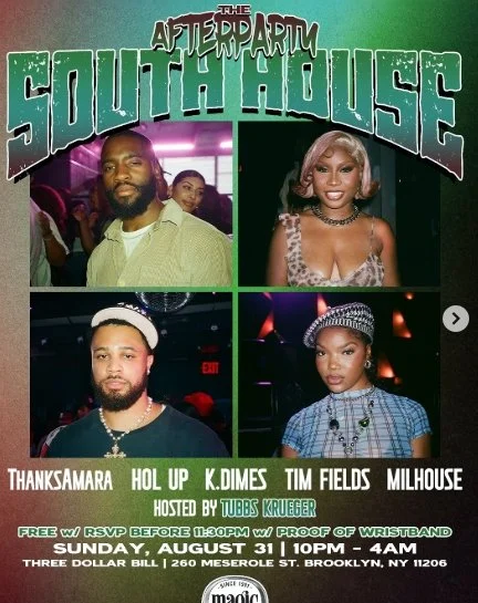 The South House AfterParty - Labor Day Weekend Sunday, August 31, 2025 10:00 PM Monday, September 1, 2025 4:00 AM Google Calendar ICS Time: 11:00 pmLocation: 3Dollar Bill, BrooklynInfo: TICKETS
