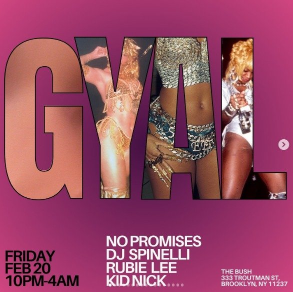 Top Gyal Friday, February 20, 2026 10:00 PM Saturday, February 21, 2026 4:00 AM Google Calendar ICS Time: 10:00 pmLocation: The Bush, BrooklynInfo: TICKETS