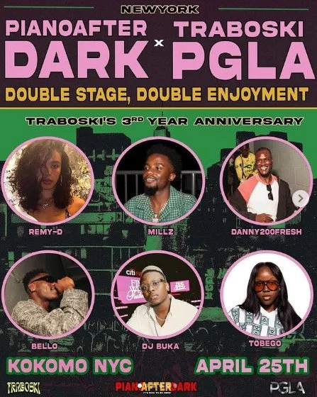 Traboski x Piano After Dark x PGLA: DOUBLE STAGE, DOUBLE ENJOYMENT Saturday, April 25, 2026 11:00 PM Sunday, April 26, 2026 4:00 AM Google Calendar ICS Time: 11:00 pmLocation: Kokomo, BrooklynInfo: TICKETS