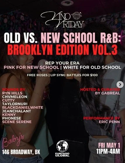 Back to All Events Vino Vriday: Old vs. New School R&B Friday, May 1, 2026 11:00 PM Saturday, May 2, 2026 4:00 AM Google Calendar ICS Time: 11:00 pmLocation: Baby's All Right, BrooklynInfo: TICKETS