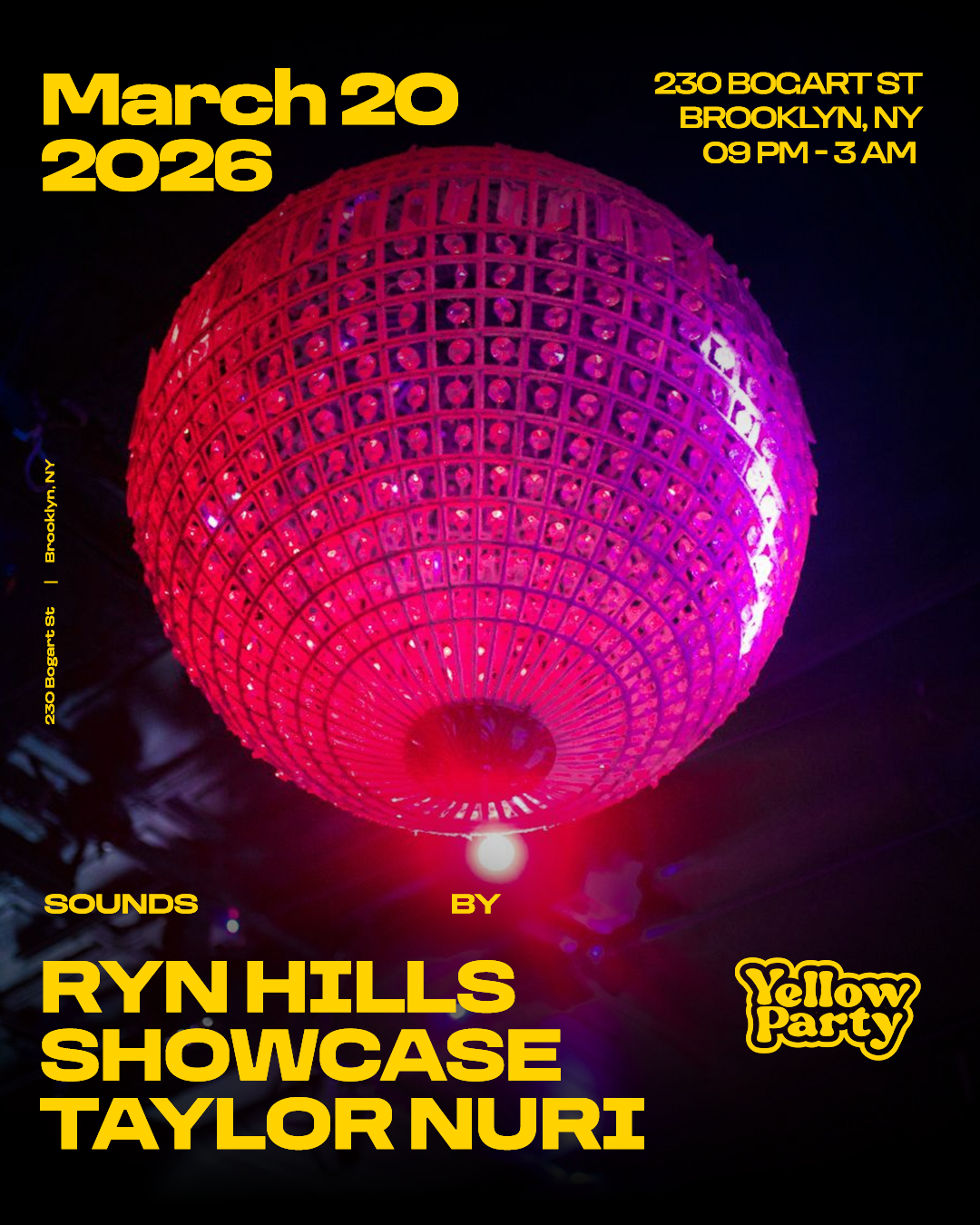 Yellow Party : Summer Tease Friday, March 20, 2026 9:00 PM Saturday, March 21, 2026 3:00 AM Google Calendar ICS Time: 9:00 pmLocation: Bogart House, BrooklynInfo: TICKETS